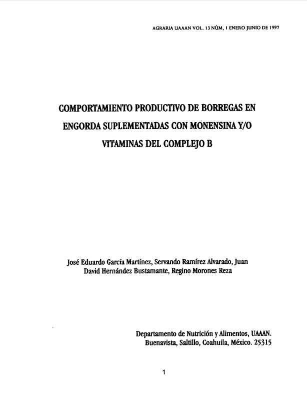 "Comportamiento productivo de borregas en engorda suplementadas con monensina y/o vitaminas del complejo b."
